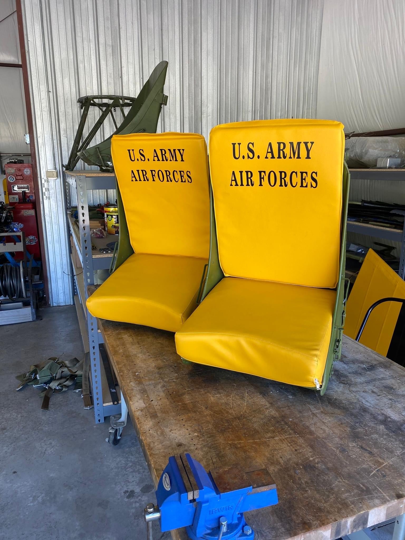 This listing is for one seat back with hooks, and one shaped seat bottom. Black lettering on seat back is for " U.S. ARMY AIR FORCES".